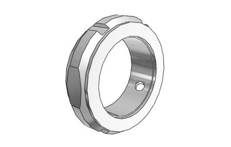 SKF Präzisions-Wellenmuttern haben drei gleichmäßig am Umfang verteilte Sicherungsstifte, die mit Gewindestiften mit Innensechskant gegen das Wellengewinde gepresst werden und die Mutter gegen Verdrehen sichern.
